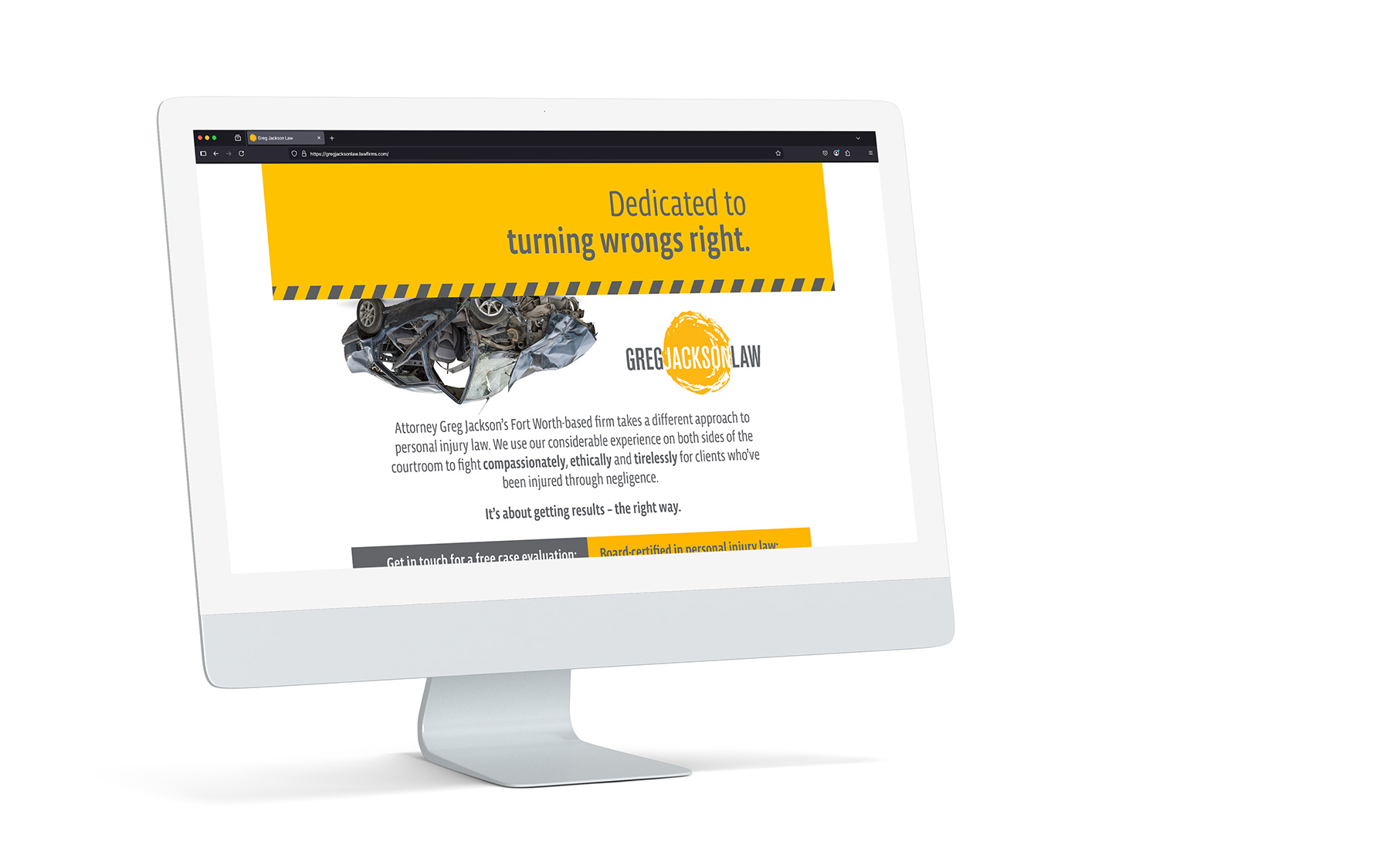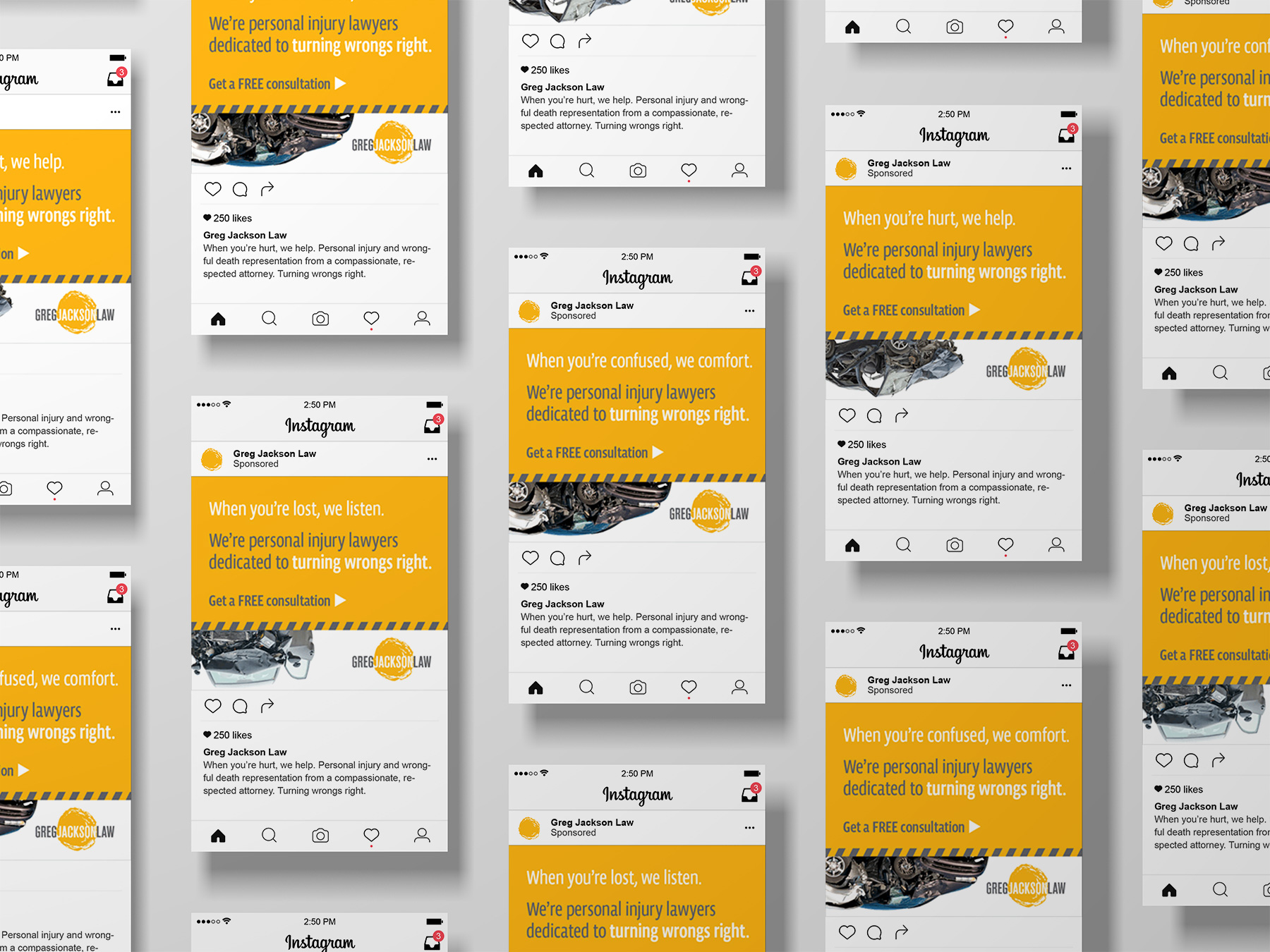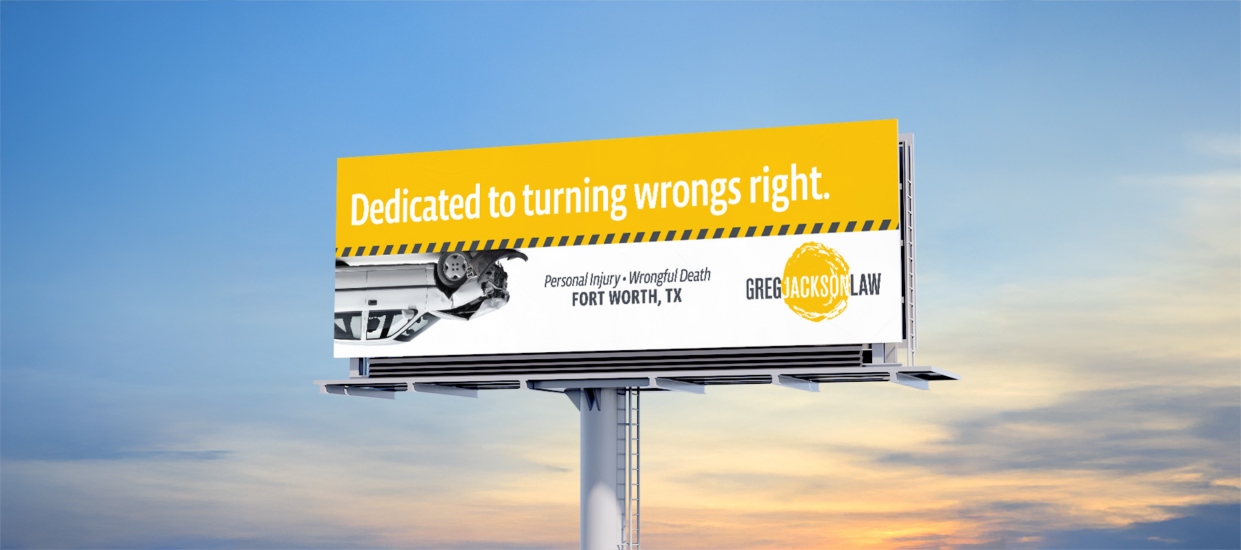 We created a striking visual brand that captured attention while conveying empathy. The creative centered on a surprising upside-down car image paired with Greg’s reassuring presence, symbolizing his ability to make wrongs right. We also refreshed his logo to show chaos transforming into stability, with his name as the anchoring element. Our creative executions included billboards, social media, search campaigns and a focused landing page.